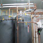 The new boiler, while smaller, is a more state of the art version of the previous—still wood gasification so we can burn wood from our site. Efficiency is greatly increased through the addition of two 400 gallon water tanks for heat storage, and the system now has a backup heat supply with a Buderus instantaneous propane hot water heater capable of carrying the building if the wood boiler goes out on a long cold night or weekend. We also added a backup generator in case the power goes out during a storm, and a water service to support the boiler system, allowing the building to be sprinklered for fire safety.