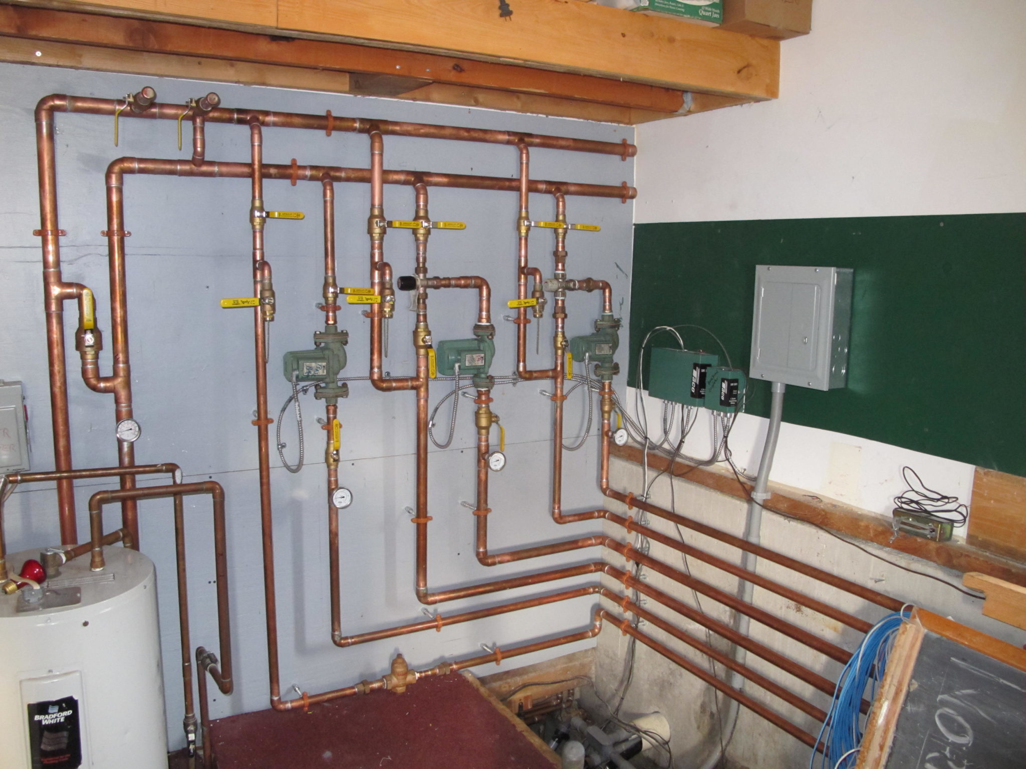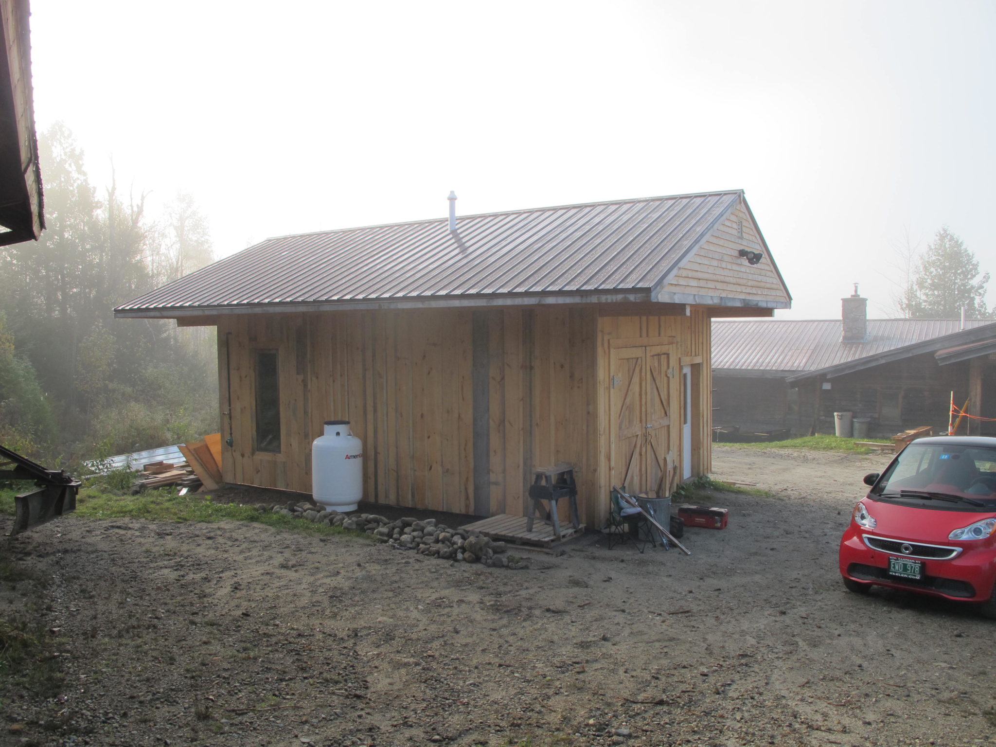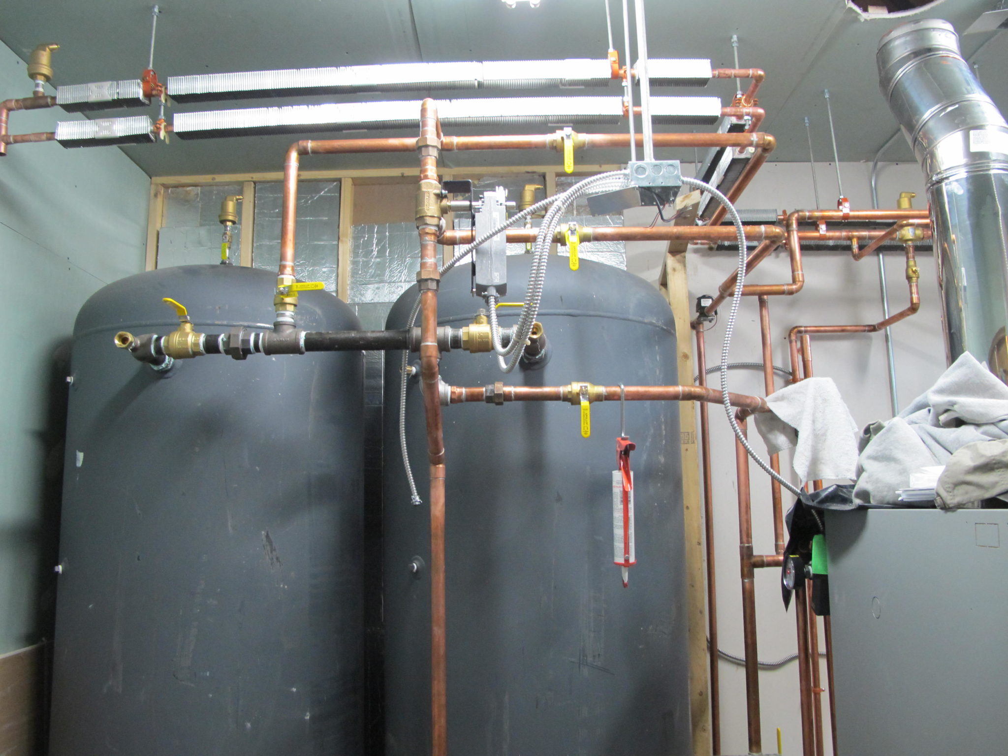 The new boiler, while smaller, is a more state of the art version of the previous—still wood gasification so we can burn wood from our site. Efficiency is greatly increased through the addition of two 400 gallon water tanks for heat storage, and the system now has a backup heat supply with a Buderus instantaneous propane hot water heater capable of carrying the building if the wood boiler goes out on a long cold night or weekend. We also added a backup generator in case the power goes out during a storm, and a water service to support the boiler system, allowing the building to be sprinklered for fire safety.