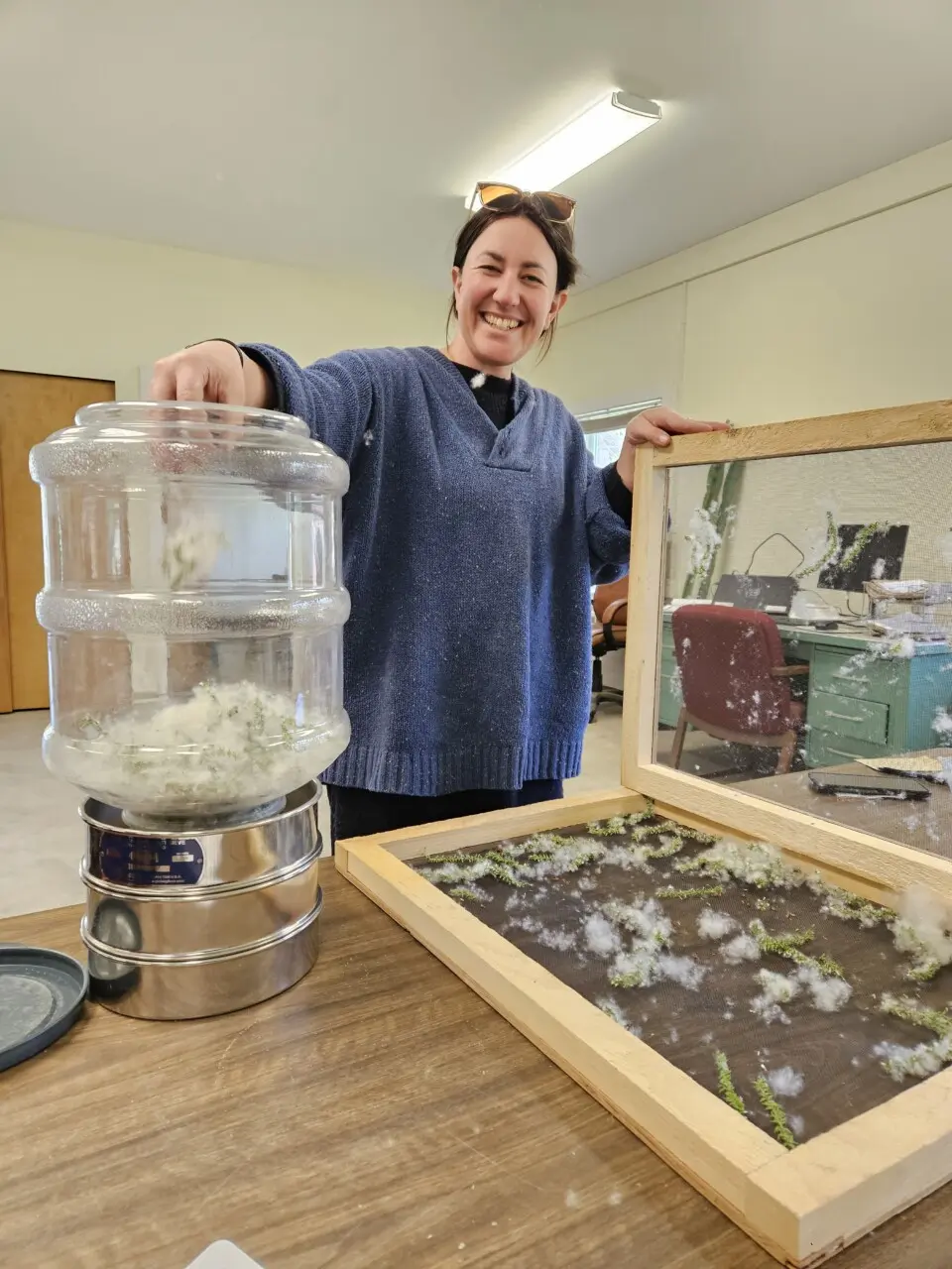 In previous years, we have stored seeds from these species encapsulated in their fluff in ziploc bags in the freezer. This didn’t seem to negatively affect their germination rates but made using the seeds difficult when applying them onto riparian restoration sites with the hydroseeder. Back in March, we spoke to a horticulturist with the USDA Agricultural Research Service in Iowa to learn about how they process seeds for long-term storage, and now that we have some fluffy spring seeds ready, we finally get to test their methods on our own seeds! By using an air compressor, a large, round plastic container, a shop vac, and metal seed cleaning sieves, we have been able to separate the tiny seeds from the fluff! This will make storage much easier and allow us to more efficiently use our collections in the hydroseeder in the upcoming year.