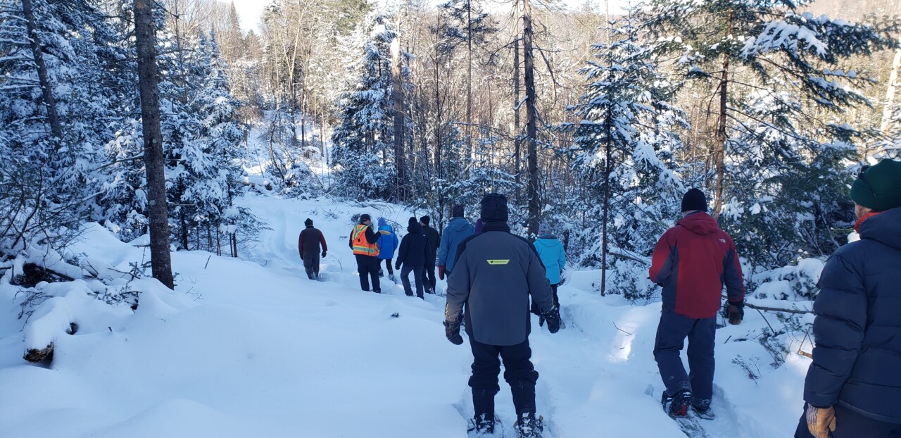 Strapping on snowshoes and bundling up for a cold afternoon out in the woods, landowners residing within the Bean Brook watershed in Newark met earlier this month to tour a recently completed timber harvest. County Forester, Matt Langlais, led participants in discussions with the consulting forester for the harvest, Charlie Stabolepszy (F&W Forestry), about the various goals, thoughtful planning, and process that were key to setting up and making this timber harvest a successful one. During the tour, participants were able to see various wildlife habitat (snags, downed wood, and large diameter eastern white pines) and ecological features (riparian areas) that were protected or enhanced during this harvest, as well as the extra planning that will allow for skiing on the logging trails after the timber harvest is wrapped up.
